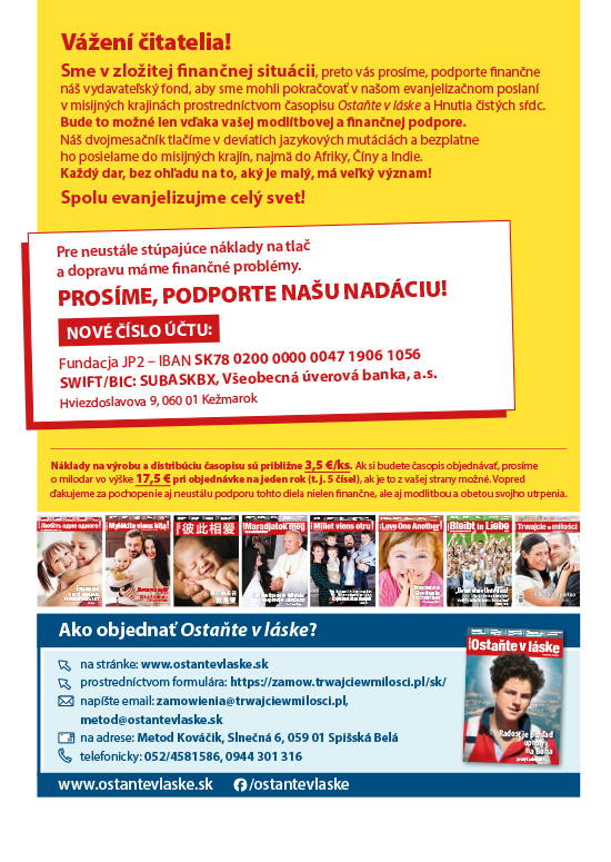 Boh má pre každého človeka posolstvo lásky. Veríme, že články a svedectvá uverejnené v časopise Ostaňte v láske 5/2025 (16) vám pomôžu objaviť a prijať túto pravdu vo svojom srdci. Pozývame vás prečítať si ich!