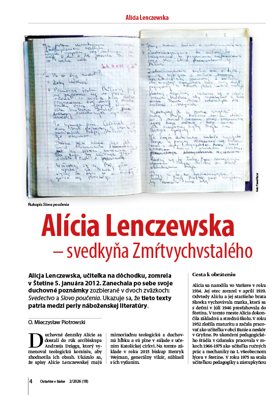 • „Alícia Lenczewska – Svedok Zmŕtvychvstalého“ – životný príbeh poľskej mystičky, ktorá zomrela v roku 2012. Zanechala po sebe mimoriadne poznámky o svojich mystických dialógoch s Pánom Ježišom.